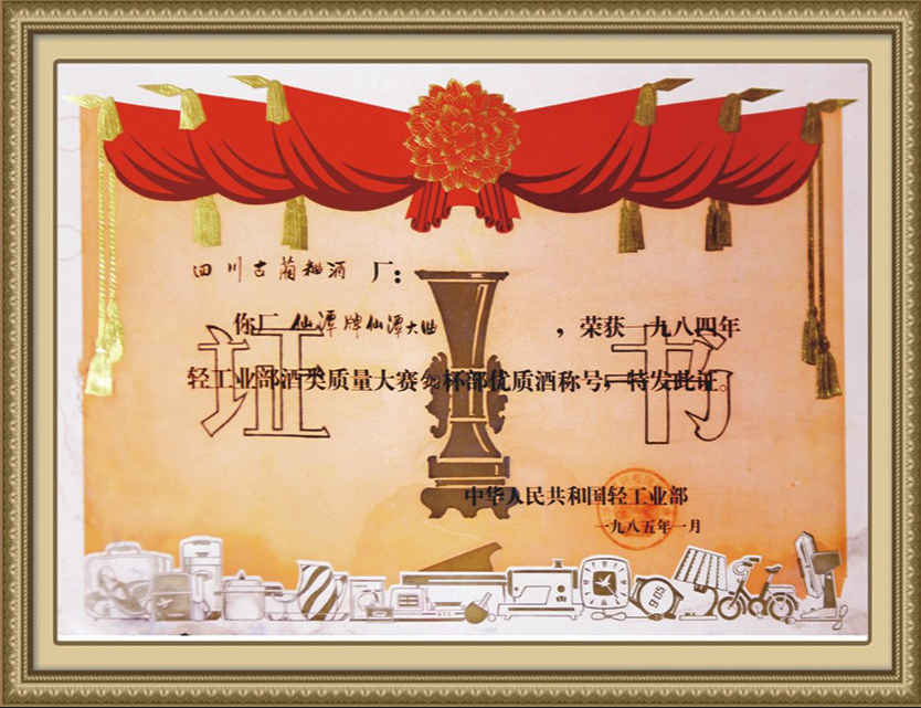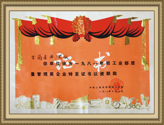 仙潭牌仙潭大曲,荣获轻工业部酒类质量大赛铜杯部优质酒称号
