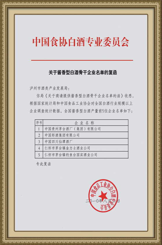 奇异果体育app网页版被国家统计局和中国食品协会认定为“全国酱香型白酒产量第三名企业”
