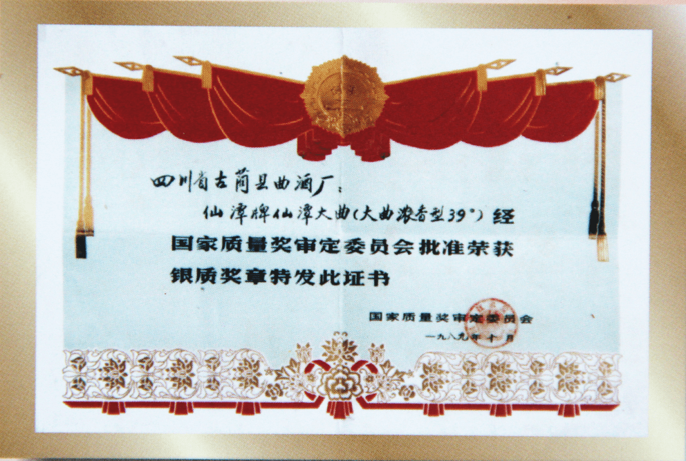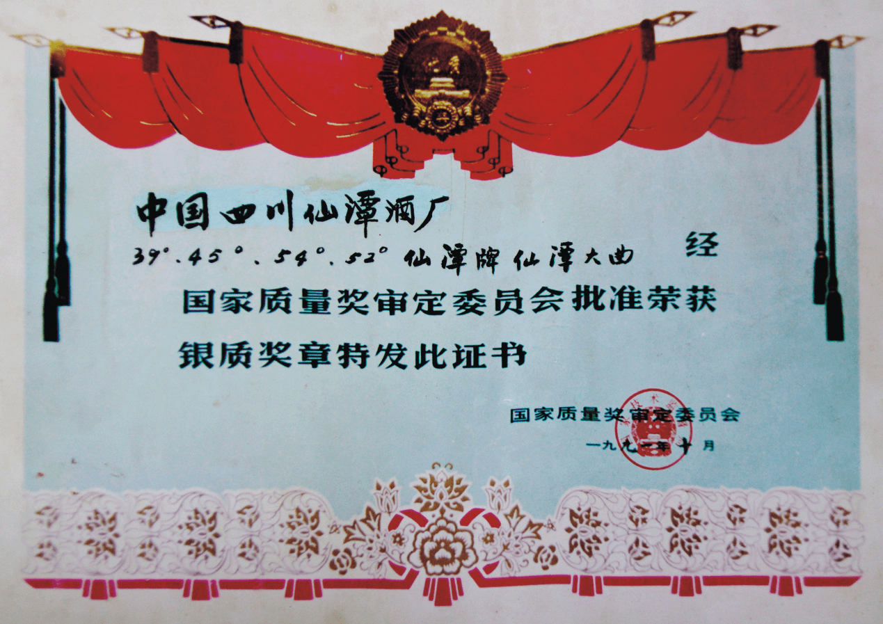 39°、45°、54°、52°仙潭牌仙潭大曲荣获国家质量奖银质奖章